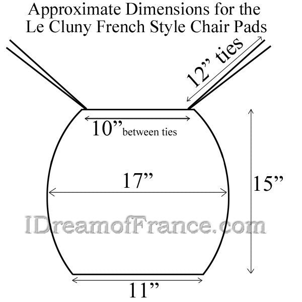 From Le Cluny French Country Collection, these coated chair pads will coordinate with our Lisa yellow table linens. They are reversible and 100% cotton coated with acrylic to make them stain resistant. Their shape is perfect for French country chairs with a narrow back. Please see the diagram with the approximate dimensions to make sure they will fit your chairs.