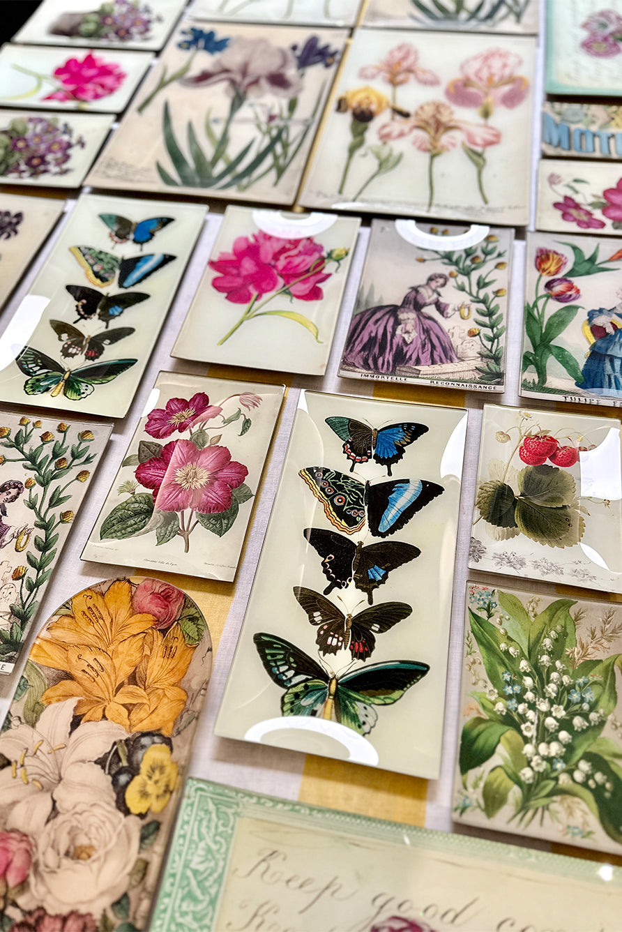 Collaged paper is delicately placed under handblown glass.
