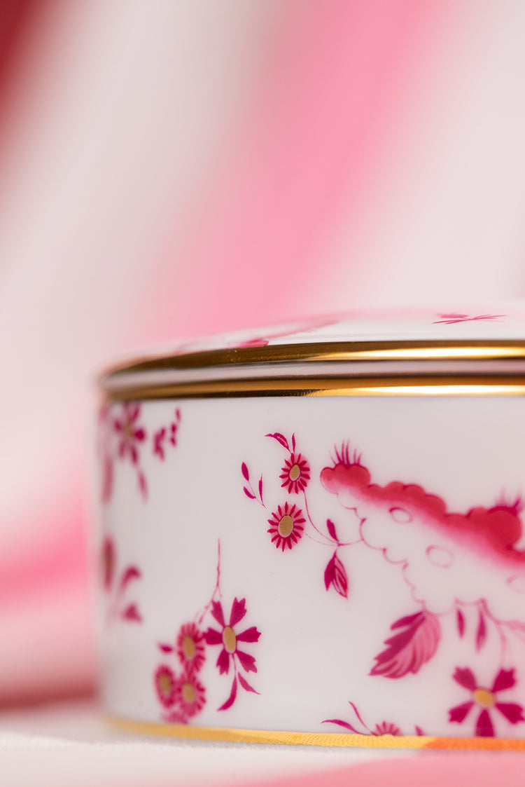 This trinket box is made of fine porcelain and has a magenta red decoration embellished with a gold thread, a distinctive signature of the florentine manufacturer. The Ji Ondori roosters, a symbol of virtue and luck, return as the protagonists of the Ginori 1735 collections, taking shape in the form of a sublime dance that immortalises them in delicate harmony with the floral decoration.