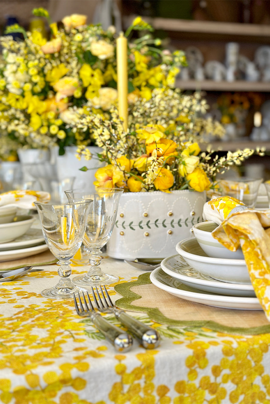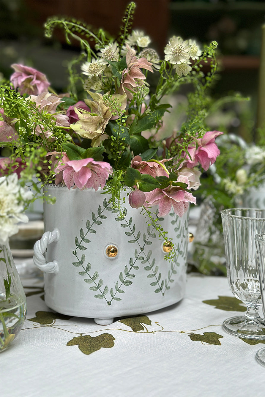 A Summerill & Bishop x Emily Mitchell Exclusive. A hand made ceramic tulipere vase with exquisite twisted handles, inspired by early English Delftware. Perfect for displaying your favourite dancing tulips or stems of your favourite flowers. This piece is hand painted with green oxide and 24ct gold leaf and is entirely handmade.